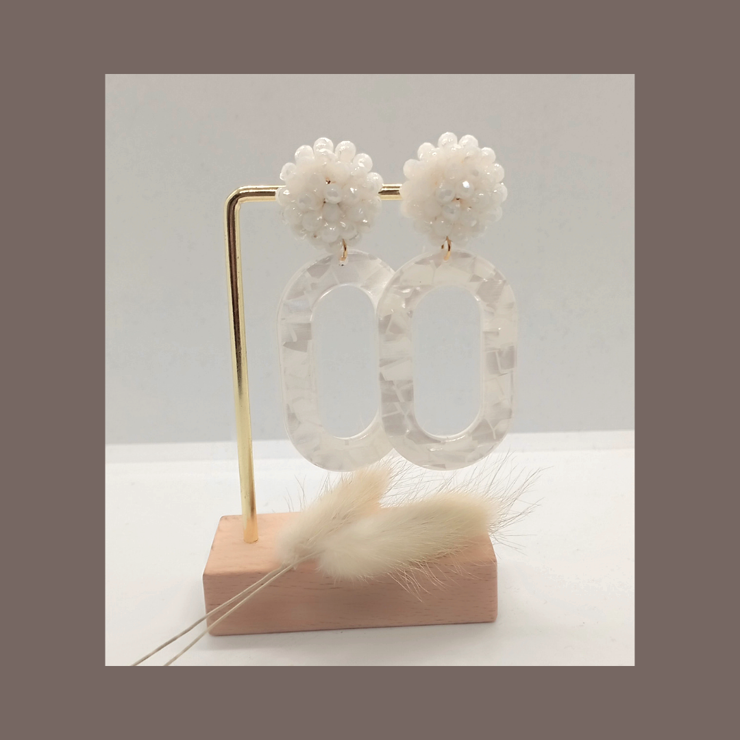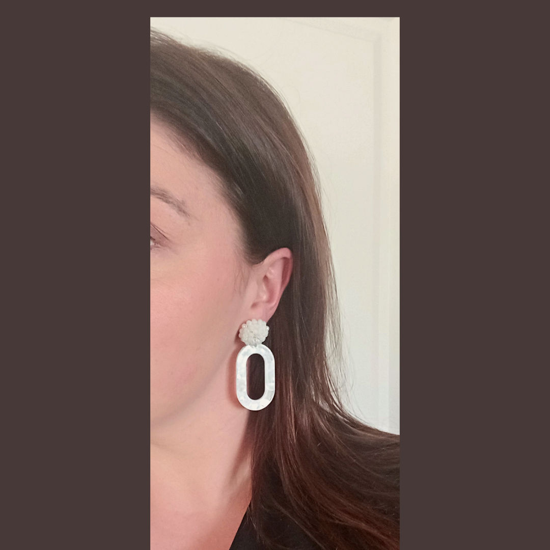 Onze betoverende witte Yvette oorbellen: een glanzende witte hanger en een oorsteker vervaardigd uit kleine witte glaskraaltjes.
